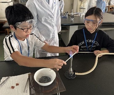 化学実験では、銅板への亜鉛めっき処理や、ガスバーナーを用いた黄銅(真鍮)づくりに取り組み、金属の色が銅の色→銀色→金色と変化していく様子に大いに興味を示していました。