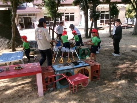 広い園庭やテラスを使って、試行錯誤しながら作った道具を使って柿とりに夢中になっていたり、つかまえたカマキリが遊ぶための迷路をつくってみたり、思い思いに遊ぶこどもたちの姿がありました。