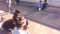 理科で、磁石を使って実験を行いました。下の写真は、磁石に多数のクリップを引っ付ける実験です。