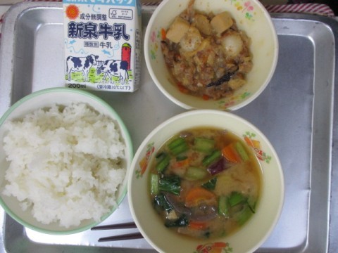 今日の献立は、牛乳・ごはん・さつま汁・ひきな餅です