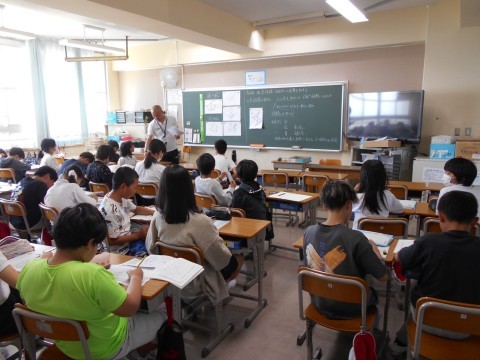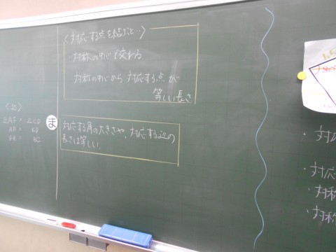 算数の少人数指導で、線対称・点対称な図形を学習しています。写真は3枚ずつ、1組教室・2組教室・算数教室の様子です。