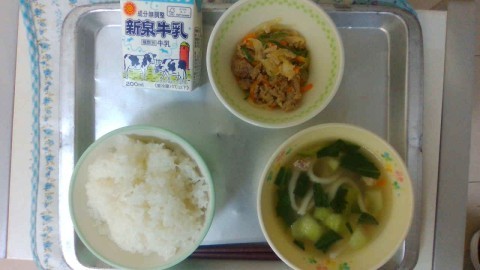 今日の献立は,牛乳・ごはん・鶏塩うどん・豚肉のごま風味です