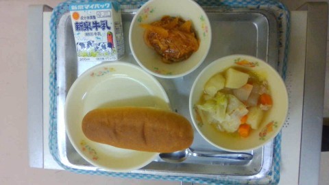 今日の献立は,牛乳・黒糖パン・ポトフ・ハンバーグきのこソースです