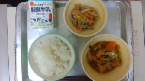 今日の献立は,牛乳・ごはん・チャージャン豆腐・ごぼうサラダです