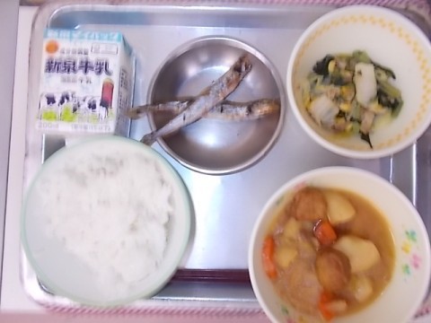 今日の献立は,牛乳・ごはん・豚肉と野菜の生姜煮・小松菜と白菜の炒め煮・焼きししゃもです