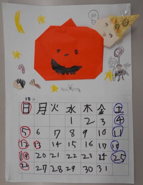 ひまわり学級から、10月のカレンダーをいただきました。テーマは「ハロウィン」で、中央に大きなカボチャがデザインされています。