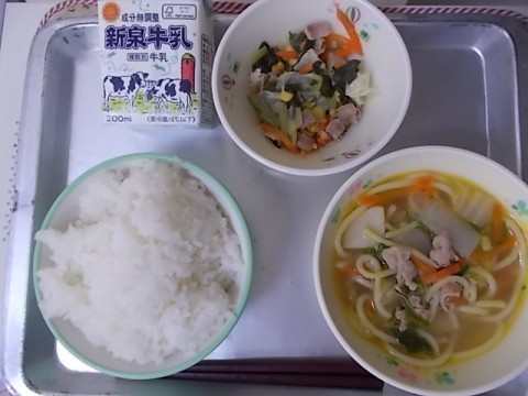今日の献立は,牛乳・ごはん・ちゃんぽん麺・小松菜サラダです。