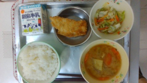 今日の献立は,牛乳・ごはん・さつまじる・キャベツの炒め物・白身魚フライです