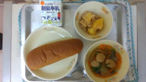 今日の献立は,牛乳・ココアパン・肉団子スープ・豚肉のみそマヨガーリック炒めです。