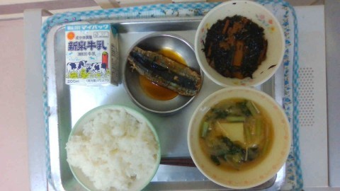 今日の献立は,牛乳・ごはん・みそ汁・ひじきの甘煮・サンマのかば焼き風です
