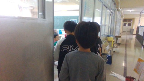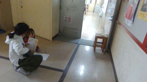 学校のどこに防火設備があるか,調べています。消火器や消火栓,煙探知機などを見つけられるかな?