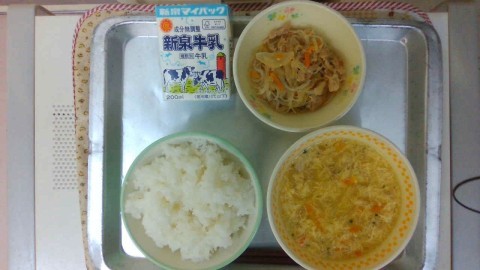 今日の献立は,牛乳・ごはん・中華風卵とコーンのスープ・マーボーはるさめです。