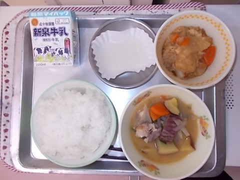今日の献立は,牛乳・ごはん・さつま汁・肉大根・ういろうです