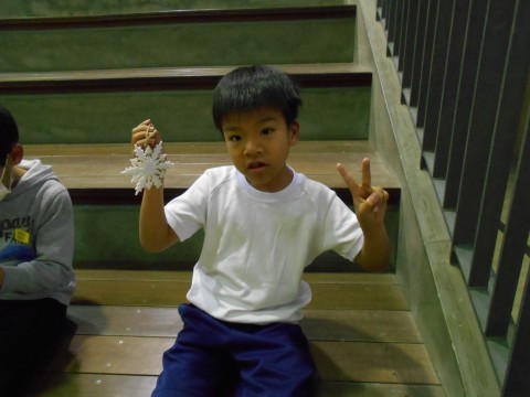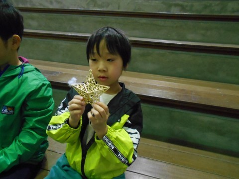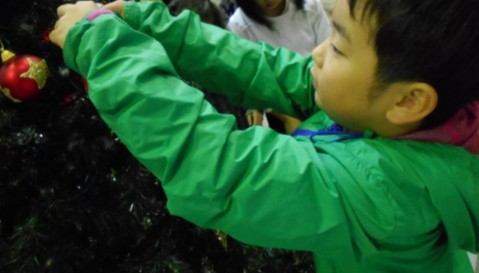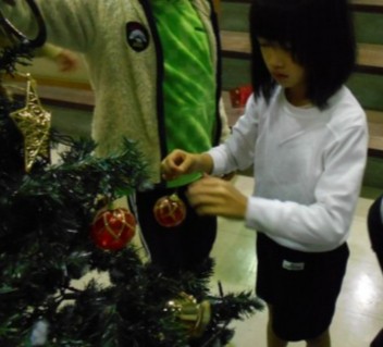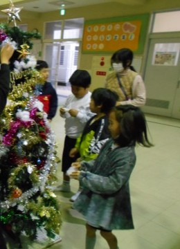 クリスマスツリーの飾りつけをしました。たくさんある中から好きな飾りを選んで,順番につけていきました。「5,4,3,2,1・・」とみんなのカウントダウンで点灯したクリスマスツリーがきれいに光っていました。