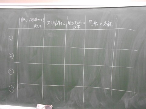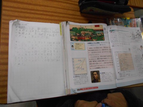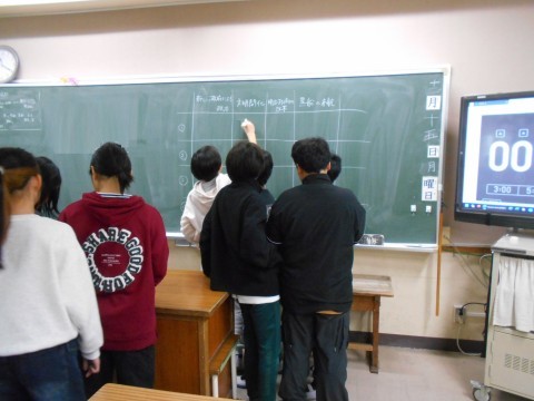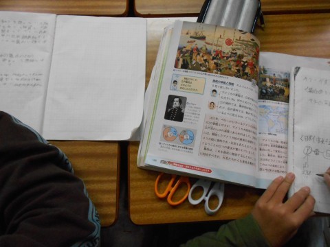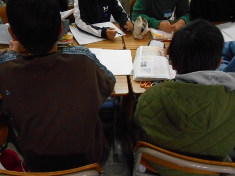 社会科の時間、班別のテーマで調べ学習を行い、その後調べた内容をクラスで共有しています。
