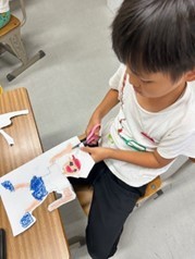 「くじらぐも」の学習では,屋上に行って「天までとどけ,1,2,3!」とジャンプをしました。雲の写真を見て,何の形に見えるか想像しました。雲の上に乗っている自分の絵を描き,気持ちを想像しました。