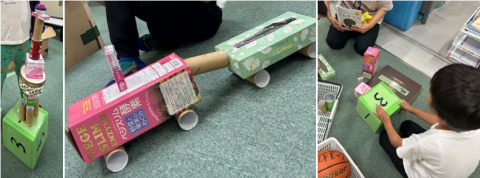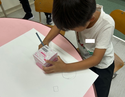 かたちあそびの学習では,箱の形ごとに分類したり,箱の面の形を写し取ったり,箱を使って電車やタワーを作ったりしました。