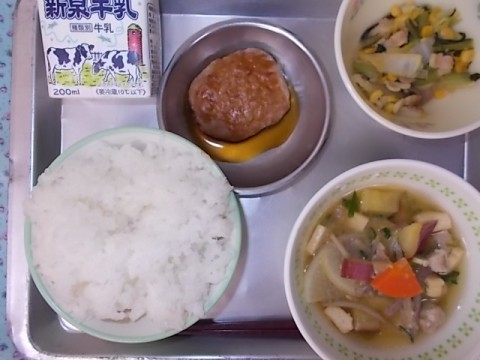 今日の献立は,牛乳・ごはん・さつま汁・小松菜と白菜の炒め煮・照り焼きハンバーグです