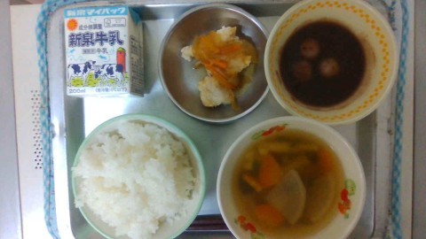 今日の献立は,牛乳・ごはん・のっぺい汁・鶏唐揚げの野菜あんかけ・白玉ぜんざいです