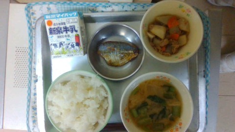今日の献立は,ごはん・みそ汁・芋煮・アジのみりん干しです