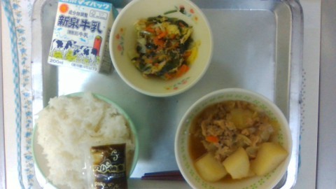 今日の献立は,牛乳・ごはん・豚肉と野菜の生姜煮・白菜とほうれん草のおひたし・海苔の佃煮です