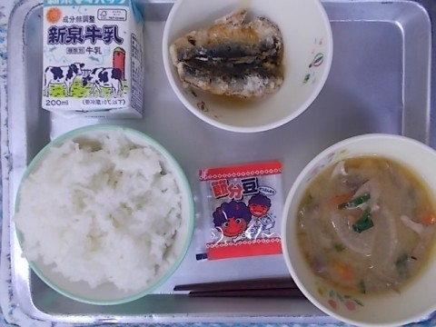 今日の献立は,牛乳・ごはん・豚汁・いわしのかば焼き風・福豆です