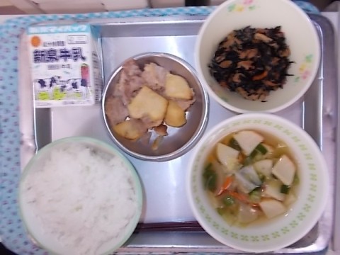 今日の献立は,牛乳・ごはん・野菜たっぷりすまし汁・ひじきの甘煮・豚肉のみそガーリック焼きです