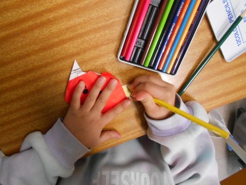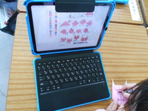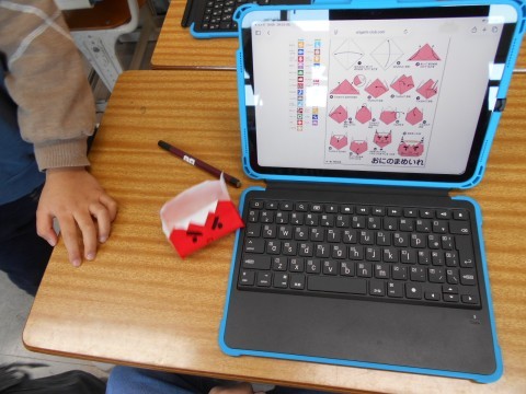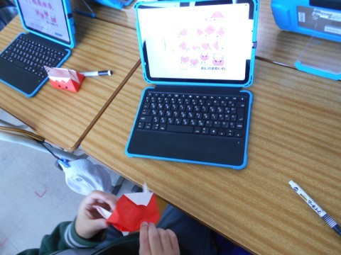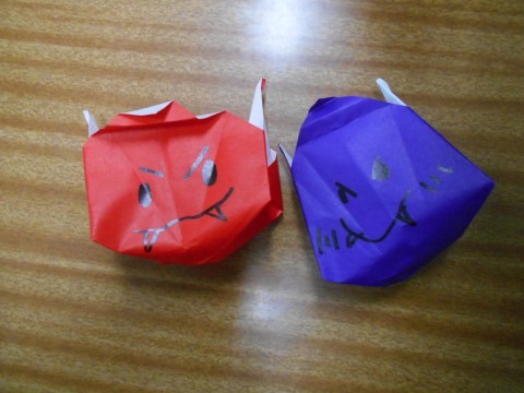 図工の時間に、折り紙で「鬼の豆入れ」を作っています。
