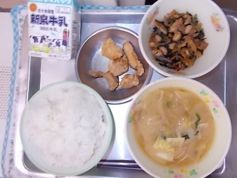 今日の献立は,牛乳・ごはん・みそ汁・鉄分たっぷり煮・チキン南蛮です