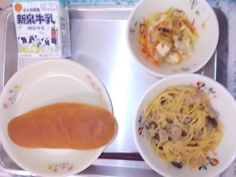 今日の献立は,牛乳・ミニコッペパン・豆腐サラダ・和風スパゲティです