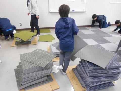 みなとルーム・カウンセリングルームの床にじゅうたんを敷いていただきました。子どもたちもお手伝いしました。