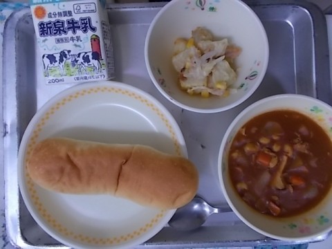 今日の献立は,牛乳・コッペパン・ビーンズシチュー・ツナとポテトのマヨネーズ風味焼きです