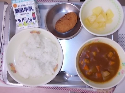今日の献立は,牛乳・チキンカレーライス・ミンチかつ・パインコンポートです