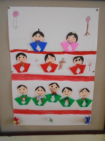1階の掲示板には、ひな人形が飾られています。
