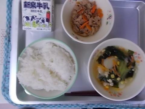 今日の献立は,牛乳・ごはん・トックとわかめのスープ・豚肉のプルコギです