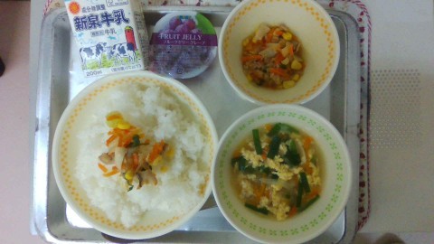 今日の献立は,牛乳・混ぜたらチャーハン・にら玉スープ・フルーツゼリーです