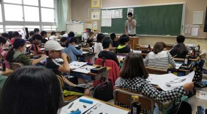 習字の授業です。今日は担任の先生と一緒に「心」という文字を練習しました。どんどん上手に筆を使えるようになってきています。手や服をよごさず書けるように集中していきましょう。