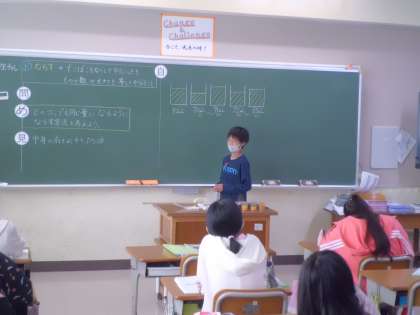 算数で自分の考えを発表しています。 黒板に書き込みながら,友だちに伝えようと頑張っています^^