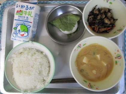 ごはん・牛乳・みそ汁・ひじきの甘煮・かしわもち