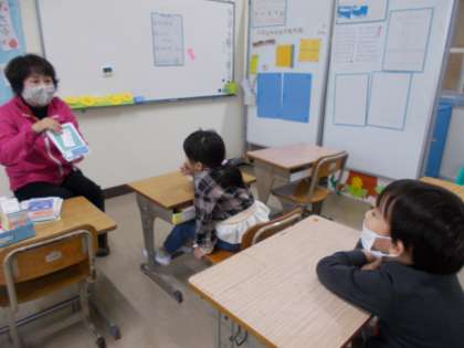 国語の学習では,イラストカードを使って「ひらがな」の学習をしています。イラストを手掛かりにしながら頑張って取り組んでいます。