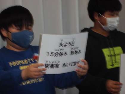 図書委員会よりお知らせがありました。今年度は,コロナの影響で,休み時間の図書室の開放を止めていましたが,堺市より図書館司書の先生が1週間に1回ですが来ていただけることになり,明日より毎週火曜日の15分休みと昼休みは,開けることとなりました。手を洗うことや消毒をして図書室に入ることなど約束を守って,利用してください。