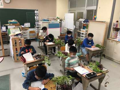 収穫後は教室に戻り,さつまいもの観察をして絵をかきました。