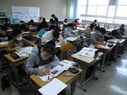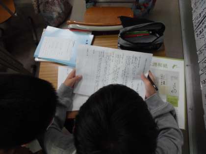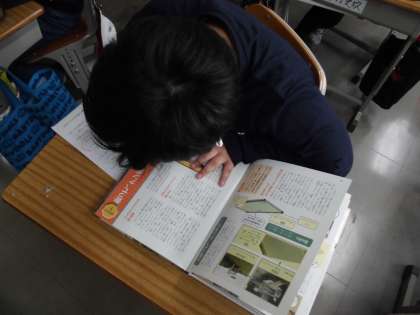 「世界にほこる和紙」の学習で,中心文を見つけ,要約することを学習した後,今度は自分で調べたい伝統工芸を決めて,本を読み,その伝統工芸の良さが伝わるように理由や例も挙げて紹介する分を書きます。調べようとする本には,教科書と違って,どこに良さについて書かれているか,理由はどこに書かれているか,たくさんの情報の中から的確に探し出さないといけません。難しい作業ですが,本を横に置き,どの子も奮闘しています。