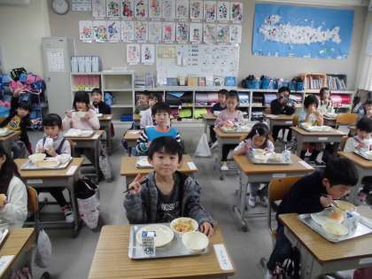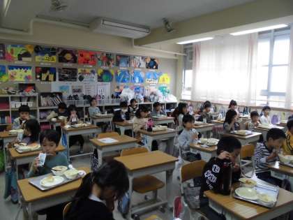 今日の1,2年生の給食中の様子です。前を向いて,静かに食べています。