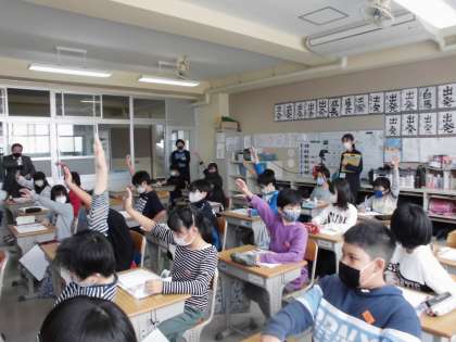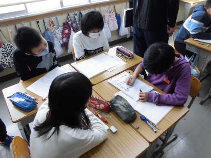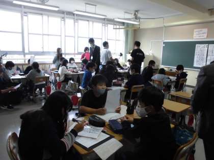 5年生の校内授業研の様子です。国語の「固有種が教えてくれること」の説明文では,図表やグラフ,写真が有効に使われていることを知り,要旨をもとにどの資料が一番筆者が伝えたいことを示しているかを考えました。全員がノートに選んだ資料とその理由をしっかり書けていました。班の話し合いでは,司会,計時,記録,発表の4つの役割を決め,全員が順にどの役も経験していきます。ひとり一人がノートに理由をしっかり書けているので,どの子も話し合いに参加できていました。たくさんの先生方が見に来られて,緊張しながら,最後まで集中して話し合いを進めていきます。友達の意見を聞いて,「うん,うん。」「なるほど!」「納得!」「あっ,そっかあ!」などと,相槌やうなづき,感想の声がいっぱい溢れ,良い学習雰囲気をみんなで作っていっていました。