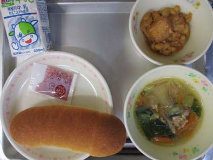 コッペパン・牛乳・春雨スープ・大豆と厚揚げのピリ辛炒め・ミックスジャム