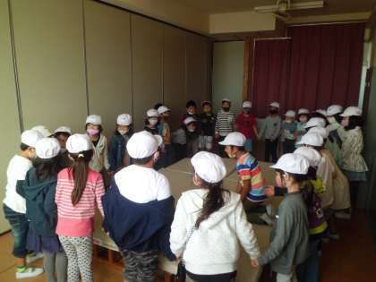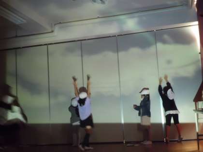 様子を思い浮かべながら読むために,今日は,実際にくじらぐもと一緒に走り回ったり,「天までとどけ,一,二,三!!」とジャンプして上に乗ったりしました。