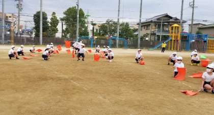 本番と同じフラッグをもって,練習を頑張っています。