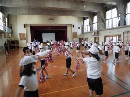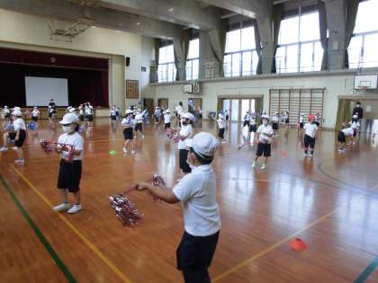 1年生は,初めての小学校での体育大会です。みんなとっても頑張っています。今まで練習に使っていた新聞紙の棒と違って,キラキラのついたポールを持つと,とってもやる気もアップ!どんどん振付も覚えて,今までうまくできていなかったところが,できるようになってきて,嬉しそうに笑顔で踊っているのを見ると,嬉しくなります。