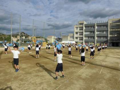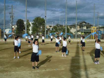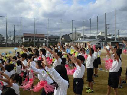 ペットボトルにクラスごとのカラーのひもを巻いて,振ったり,たたいて音を鳴らしながら元気よく踊ります。初めの頃は,音が揃っていなかったし,鳴らしてはいけないところで鳴らして注意を受けたりもしていましたが,今は,もうバッチりです。みんなで集中して踊っています。大拍手をお願いします。